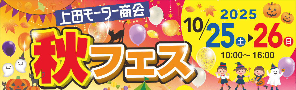10月25日・26日開催!エアートランポリンや無料の屋台コーナー、新車展示会など盛りだくさんの上田モーター商会の秋フェス。当日はアンケートに答えて豪華景品GETのチャンスも!ぜひご家族でお楽しみください!
